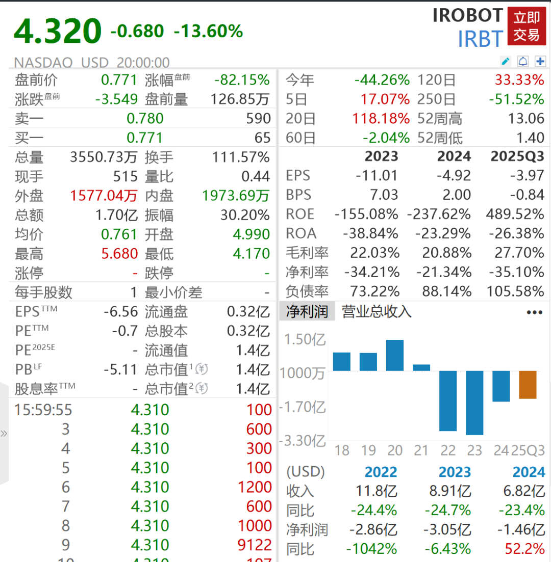 12月15日智慧财讯,美国扫地机器人鼻祖iRobot在宣布申请破产并寻求制造商收购后,其美股盘前股价暴跌82%至0.77美元。