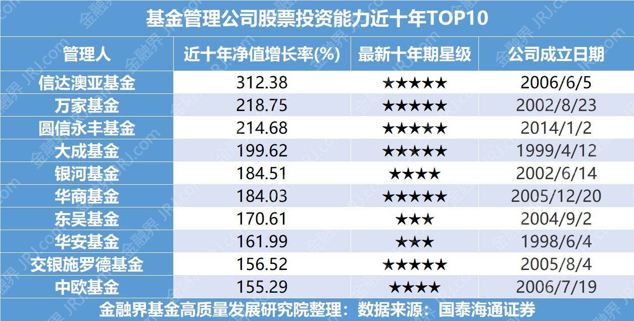 随着今年前三季度行情收官,A股市场曾站上4000点,创下近十年新高,市场目光再次聚焦于那些历经牛熊考验、具备持续盈利能力的公募基金机构。10月31日,国泰海通证券发布的截至最新的基金公司近十年股票投资能力榜单,为我们提供了一个观察长期投资表现的窗口。